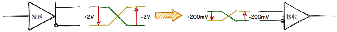 长距离布线会有信号衰减,而且引入噪声和干扰的可能性更大,在线缆A和B上的表现就是电压幅度的变化,但是,采用差分线的好处就是,差值相减就会忽略掉干扰依旧能输出正常的信号,把这种差分接收器忽略两条信号线上相同电压的能力称为共模抑制。