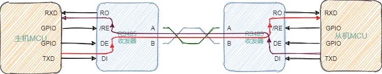 主机的GPIO会控制RS-485收发器的DE管脚,设置发送模式,从UART TXD线向RS-485收发器的数据(D或DI)线发送一个字节,收发器将在A和B线上将单端UART位流转换为差分位流,数据离开收发器后,主机立即将收发器的模式切换为接收模式。