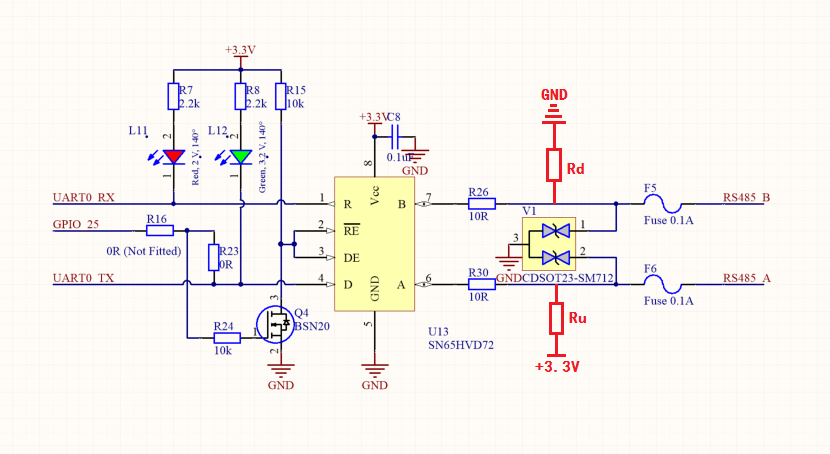 1)使能信号RE和DE可采用一个GPIO控制,节省资源,GPIO25输出高电平,RE=DE=0V,进入接收模式;GPIO25输出低电平,RE=DE=3.3V,进入发送模式。