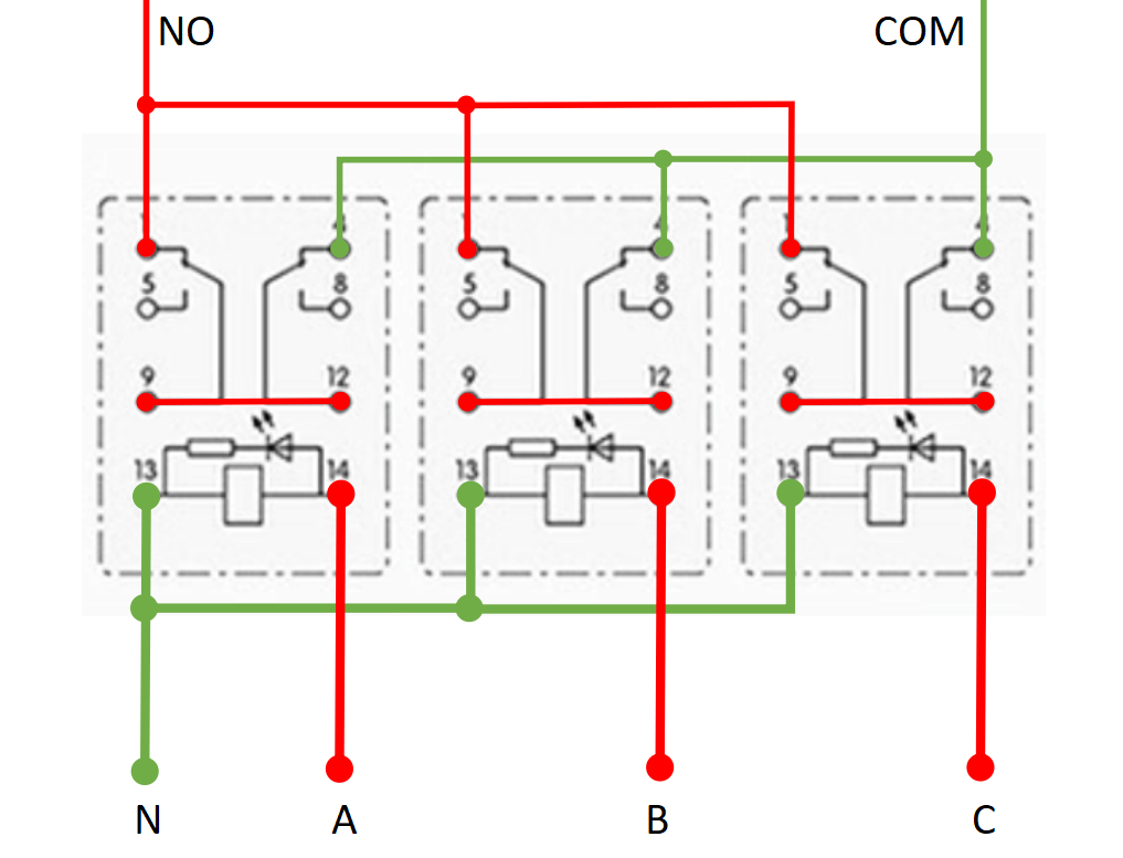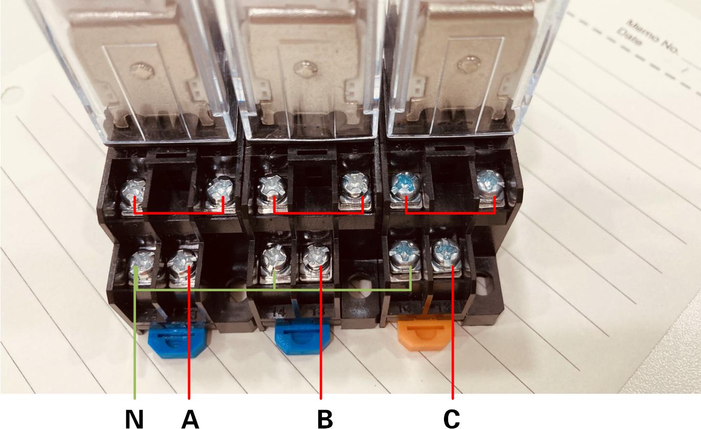 这是监测输入端。将三个继电器线圈的一端接在一起,接供电零线N,三个继电器线圈的另一端,分别接三相电源的三根相线A、B、C。