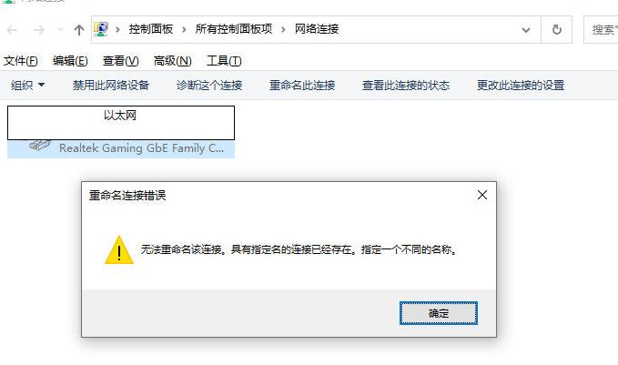 如下图,欲将原连接改名为“以太网”显示“无法重命名”