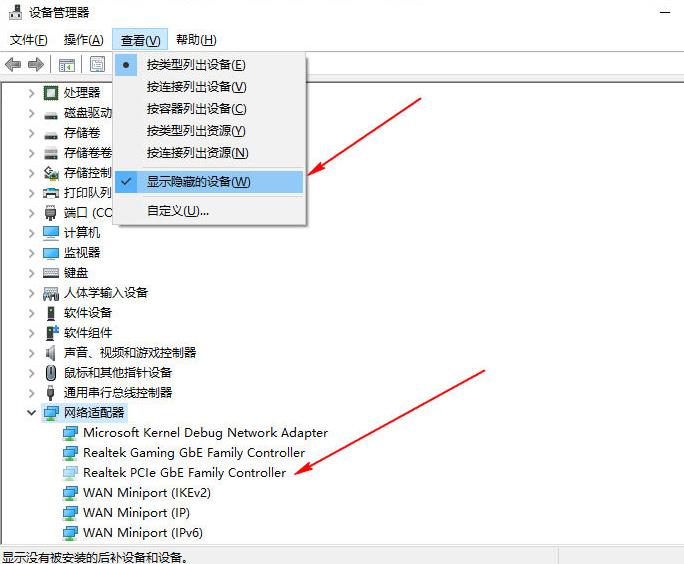 1、打开设备管理器,点查看,把“显示隐藏的设备” 打钩