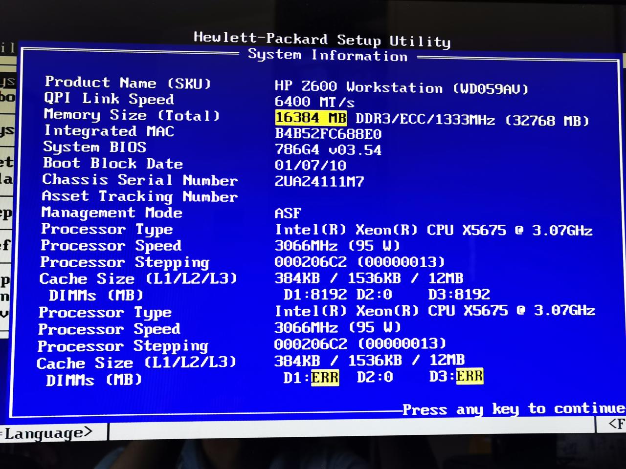 一台二手HP Z600 图形工作站,闲置大半年后无法开机。无法识别所有内存,有时免强进入启动界面,也会卡死在微软徽标处。