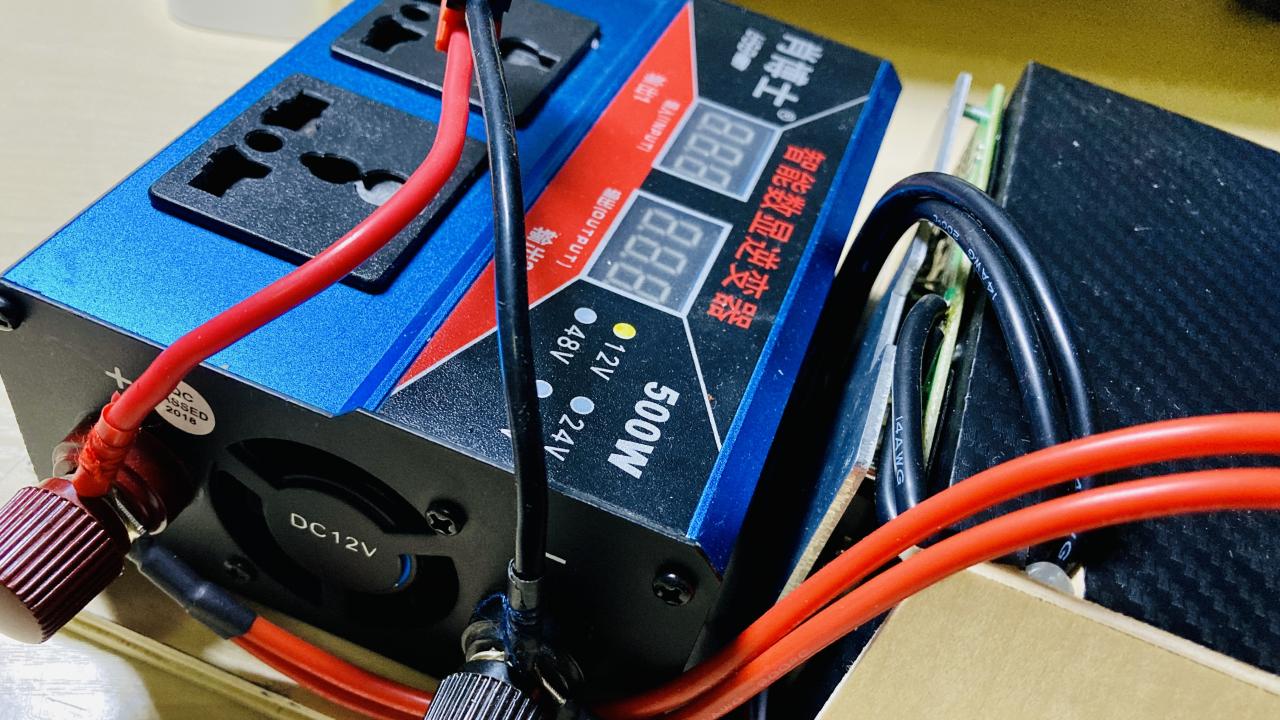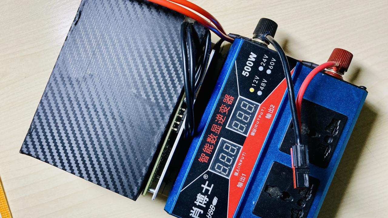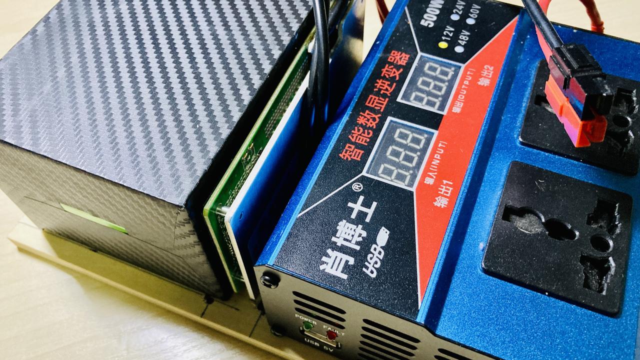 将电池和500W修正波逆变器一起安装在一块木板上,用来照明、手机/笔记本充电还是蛮不错的,实测空载电流0.07A,转换效率最大97%,这些可都是纯正弦波逆变器所无法做到的!