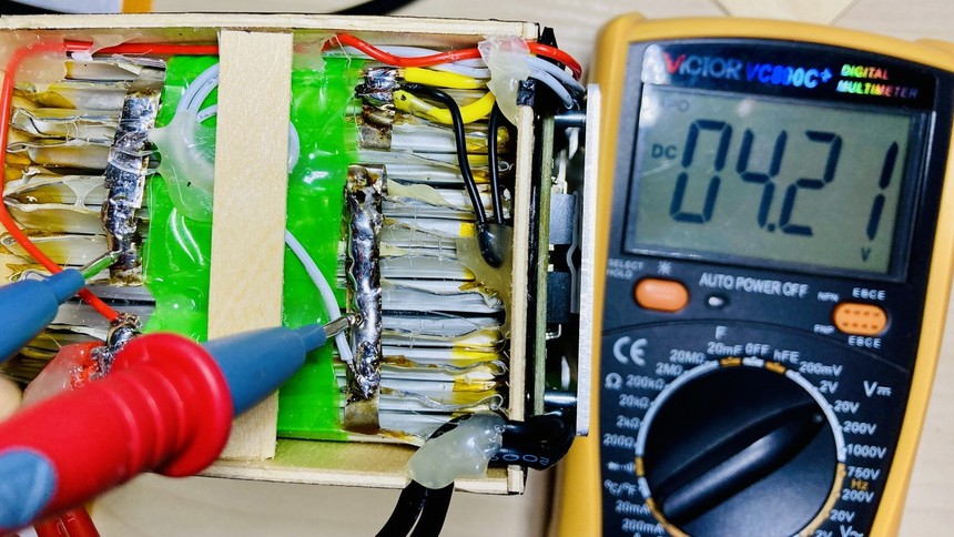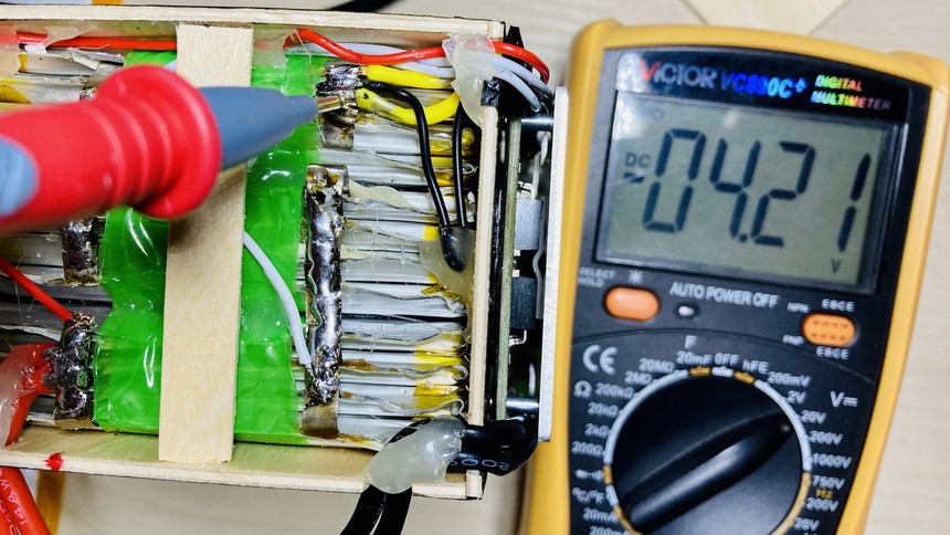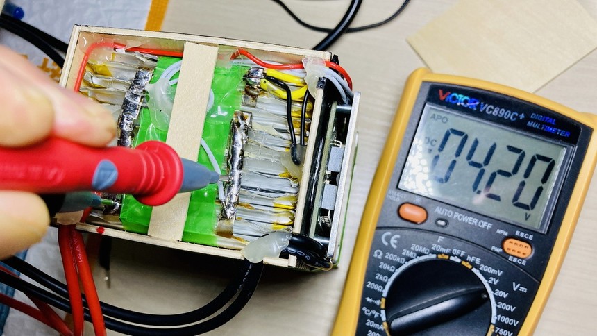 按照计划的电池极性方向,将3组共12片电芯叠合在一起,期间务必注意电芯电极绝缘。按照叠合在一起的外形尺寸,用3mm厚薄木板制作外壳,用仿碳纤贴纸包裹。