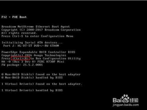 1、重启服务器,等会就能看到Crtl+R的界面,然后按下Crtl+R可以进入raid设置界面。如图所示: