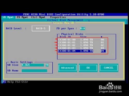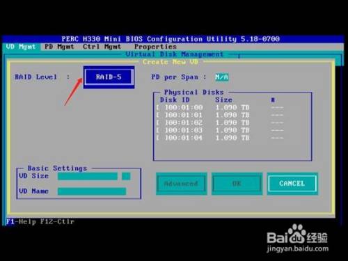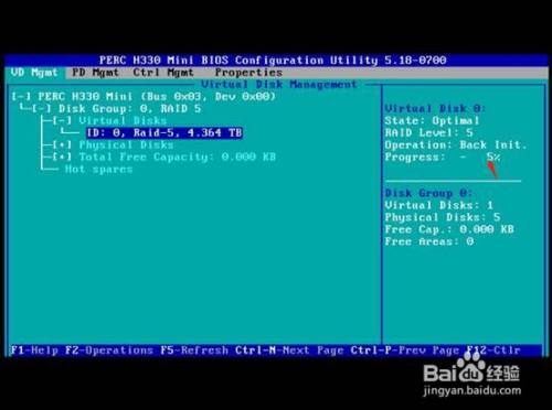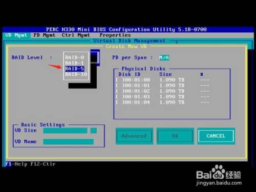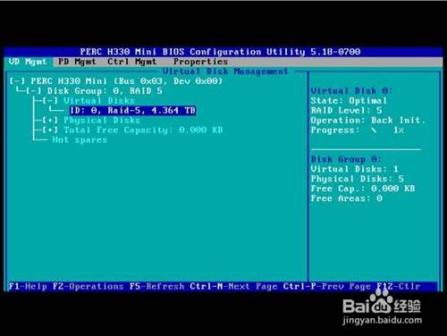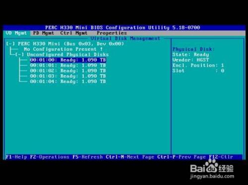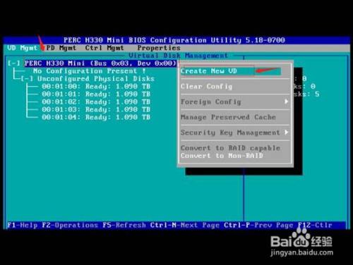 3、把选项移动到最上面:PERC H330 Mini,按F2键,选择:create New VD,创建一个raid组。如图所示: