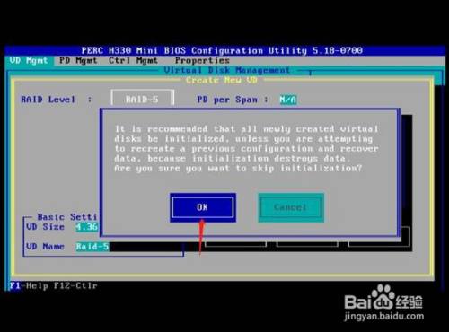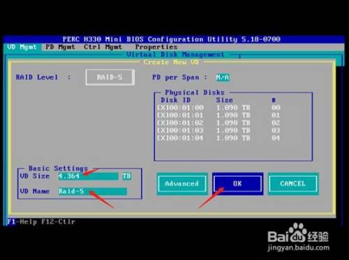 7、按tab键,调到下一个,手动设置一个VD name(raid-5),这里也看到总的空间大小,然后点击:OK,即保存。如图所示: