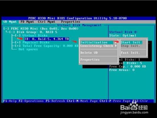 10、格式化一下刚刚创建的raid,选中到:raid-5,按F2键,初始化raid,选择:initialization--star init,如图所示: