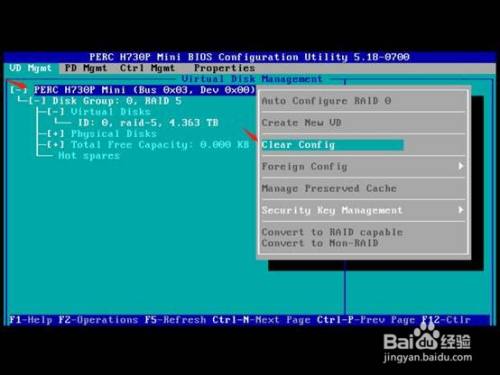 14、也讲一下删除raid组,把我们刚刚创建的raid删除,选项移动到最上面:PERC H330 Mini,按F2键,选择:clear config,如图所示: