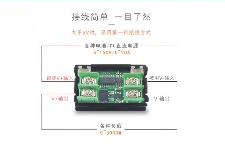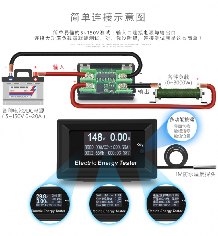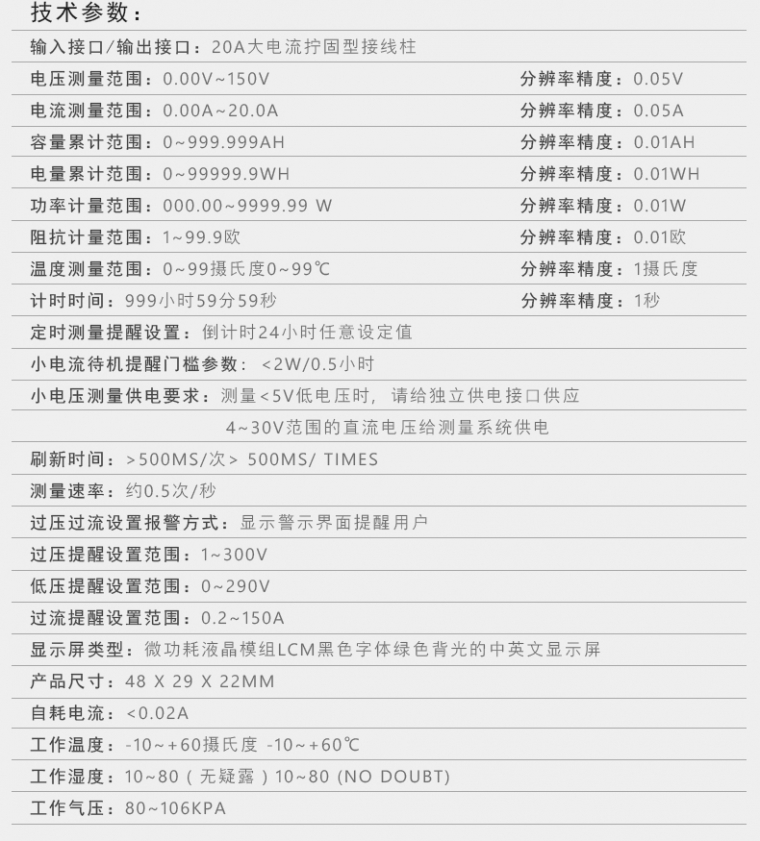 高精密测量发烧款的宽电压大电流的3000W高功率测量直流电能表,可以单屏同时监测显示直流的电压、电流、容量(mAh)、功率(W)、电量(WH)、温度、电流时间的改装小装备,采用进口采样器件,高清LCM液晶并且分辨率达到128*64=8192像素点阵型高清显示屏以及内置中文英文字库,使得测量内容更加丰富,通过电能表上面的按键操作,可以清零电量、容量、时间等数据的同时,还能设置倒计时以及智能自动待机等操作,让可玩性更高,通过按键设置电池放电电压门限显示提醒,以便在对电池测量放电时的显示提醒,防止对电池测量低压门限过放电损伤电池的可能性,提高玩测电池的可玩性安全性,另外炬为科技此次采用独立供电接线方式,可以DIY接线测量到0-5V的低电压值 测量范围为150V20A 市场上锂电池 电瓶 充电器等直流电设备都支持兼容检测。(150V20A直流表发货配件:主机*1 温度探头*1 独立供电线*1)