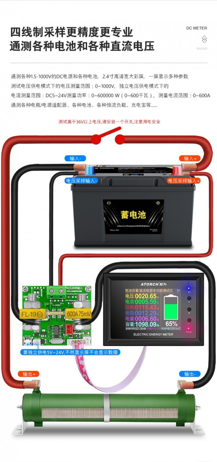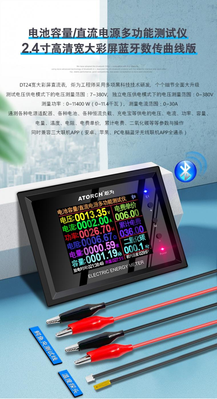 产品简介: 此款产品为多功能型,可以用在电池内阻测试,容量测试,电量测试,电压电流测试,监控直流电参数,百分比电量显示,改装电动车,房车等多方面使用。测量任何电池通用,无论是铅酸电池的,还是三元锂电池或者磷酸铁锂还是其他类型的直流电池,只要工作电压范围(0~1000V)基本通用,运用广泛测量,还可以无线联机,装在汽车内部都可以联机手机/电脑检APP测数据,新升级大于设置电压报警,小于设置电压报警,超功率报警等多种保护设置(如果需要断电,请另外购买断电继电器,控制切断电源)炬为科技工程师再度突破发力,设计上市更新款的宽电压大电流380V/30A大功率大彩屏蓝牙无线数传曲线版多功能电能表,支持3大上位机联机系统APP软件,安卓苹果PC电脑蓝牙无线连接通杀应用,各种测量参数一应俱全,适应多种测量应用,一机多用。